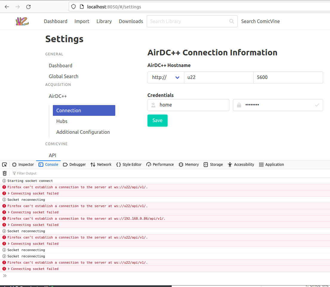 I'm attempting to connect to AirDC++ without success. I have the protocol, hostname, port, and creds correct. I've attempted to connect to AirDC++ running on a separate server as well as a local instance. I can connect to both AirDC++ instances using the web browser.
